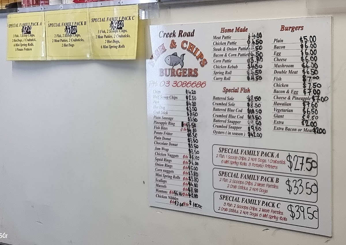 Located in a convenient spot on Creek Road, this local diner has quickly earned a reputation for its high-quality food and excellent service. Whether you choose to dine in or take away, Creek Road Fish & Chips delivers a satisfying meal every time, with no shortage of great options on the menu.