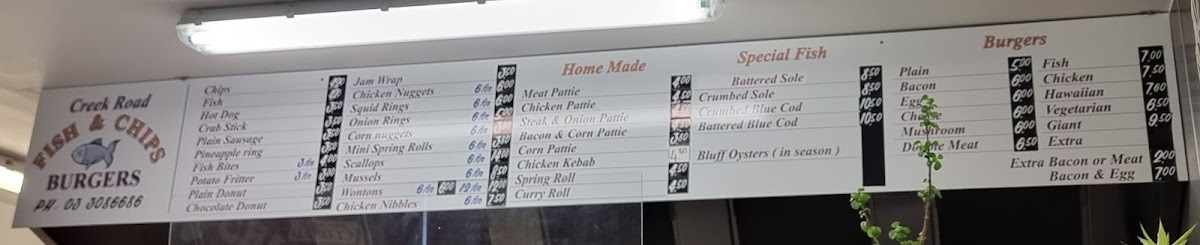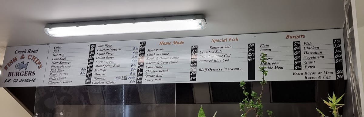 The menu at Creek Road Fish & Chips offers a satisfying variety of options perfect for any taste. Their homemade patties, including Meat Pattie, Chicken Pattie, Steak & Onion Pattie, Bacon & Corn Pattie, and Chicken Kebab, provide hearty choices for those craving something different from the usual fish and chips. For those seeking classic fish dishes, the Battered Sole, Crumbed Sole, Battered Blue Cod, Crumbed Blue Cod, and Battered Snapper are standout options. Each dish offers a delightful, crispy coating with tender fish inside. The burger selection caters to various preferences with choices like the Plain, Bacon, Egg, Cheese, and Mushroom burgers, allowing for easy customization. Additionally, side dishes such as Chips, Half Scoop Chips, Hot Dog, Crab Stick, and Plain Sausage complement the meal. Whether you're in the mood for a filling burger, a crispy fish meal, or a satisfying side, Creek Road Fish & Chips has something to please every palate.